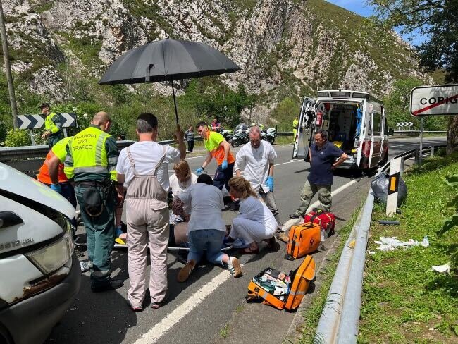 Hasta el lugar del accidente se desplazaron agentes de la Guardia Civil de Tráfico además de una UVI móvil de los centros de Salud de Santillán y Cangas de Onís. Tras asistir a la mujer para trasladarla posteriormente al helicóptero que la evacuaría al Hospital Universitario Central de Asturias (HUCA), los equipos sanitarios trasladaron al varón al Hospital de Arriondas.