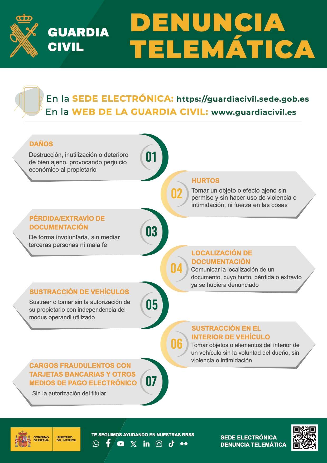El trámite se realiza a través del enlace https://guardiacivil.sede.gob.es o bien desde la web corporativa de Guardia Civil www.guardiacivil.es En la plataforma se pueden realizar cinco procedimientos penales –daños, hurtos, sustracción de vehículos, sustracción en interior de vehículos y cargos fraudulentos con tarjeta bancaria u otros medios de pago electrónico- y dos procedimientos administrativos –pérdida o extravío de documentación y localización de documentación-.