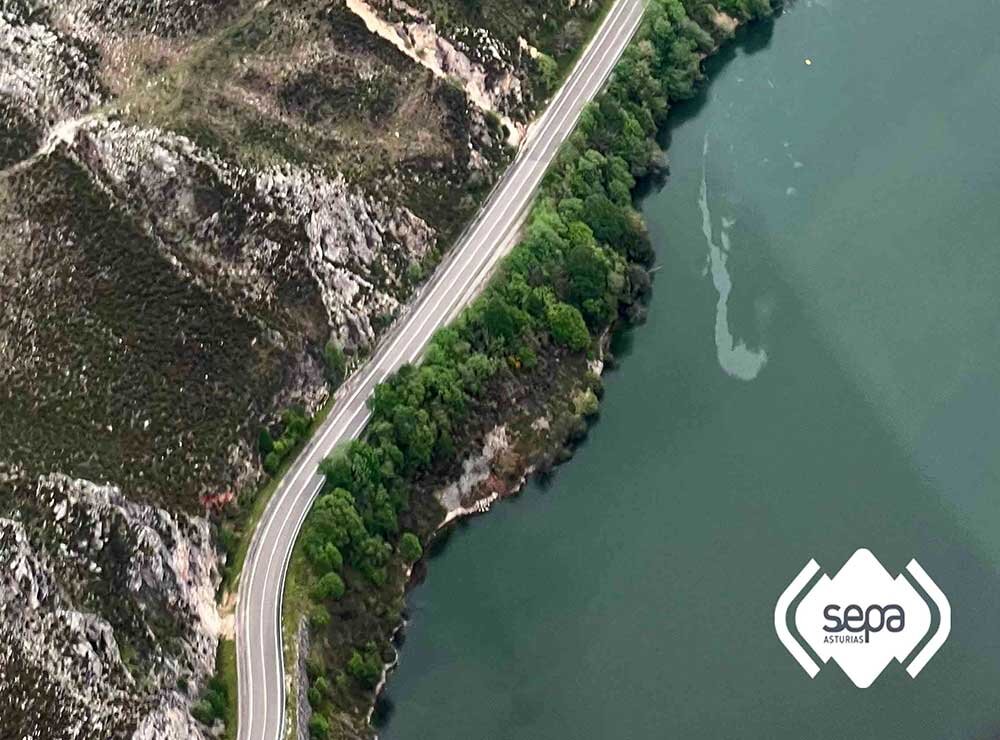 Manchas de aceite y fuel en las aguas del pantano de Tanes, donde se hundió el helicóptero del Servicio de Emergencias del Principado de Asturias.
