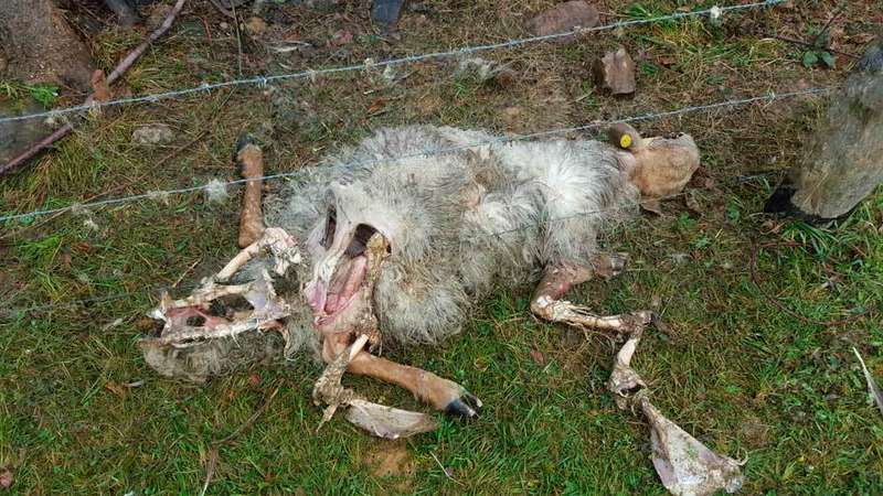 El ataque de uno o varios lobos al rebaño que estaba en una finca cerrada con alambre de espino, se saldó con una auténtica carnicería, que continuaron los buitres una vez que los lobos se hartaron y dieron por concluido el festín.