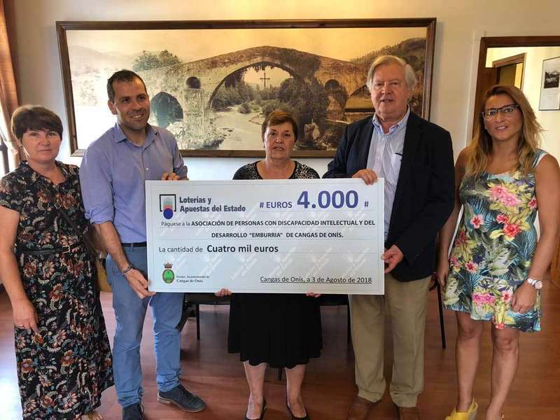 La nueva presidenta de la Asociación de Personas con Discapacidad Intelectual y del Desarrollo “Emburria” , María Luisa Larrea Blanco, recogió hoy en el Ayuntamiento de Cangas de Onís el talón de 4.000 euros que le entregó Roberto Morales Fernández, Delegado Comercial de Lotería del Estado en Asturias. El acto tenía lugar en el Ayuntamiento de Cangas de Onís, con la presencia del alcalde, José Manuel González Castro.
