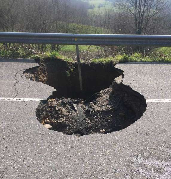 El socavón entre Corao y Labra afecta a la carretra As-340 (Corao-Nueva de Llanes) y obliga a los vecinos de la zona: Labra, Zardón, Igena..., a tener que acceder a través de la carretera CO-3, que sube a Cardes, Onao y Tresanu, desde Susierra.
