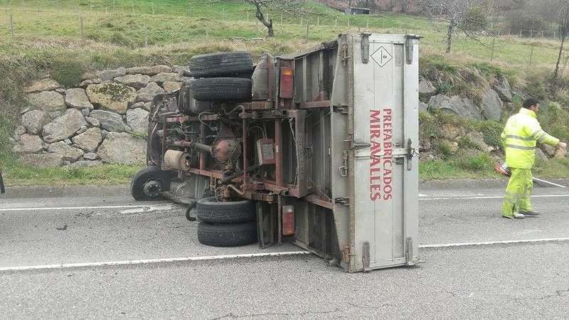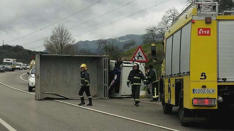 La colisión entre un camión ligero Iveco Daily, de la empresa Pefabricados Miravalles y un turismo Audi 100, provocó el vuelco del primero y que tuvieran que intervenir cuatro efectivos del Parque de Bomberos de Cangas de Onís y tres bomberos de Piloña, que llevaron a cabo la excarcelación de los conductores de dos vehículos. El impacto entre ambos vehículos mantuvo cortado uno de los dos carriles de la Nacional mientras trabajaban los Servicios de Emergencia