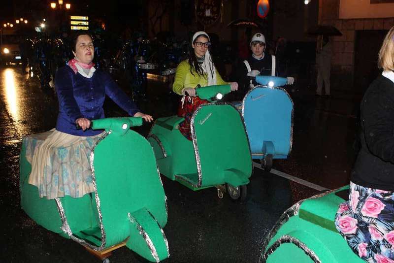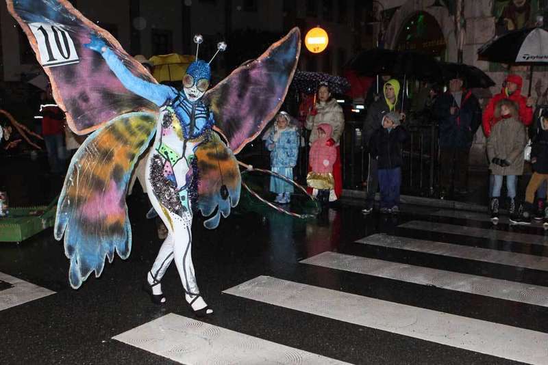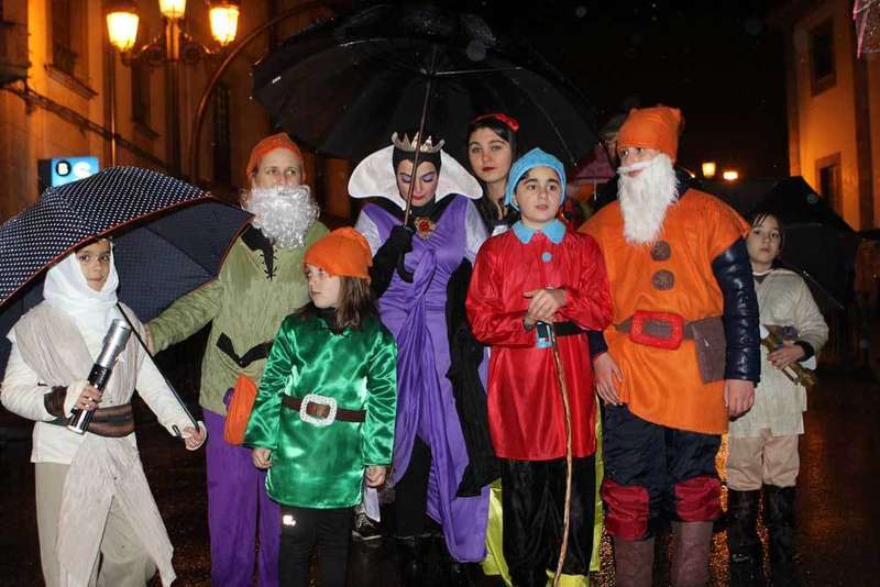Hacía tiempo que no llovía tanto y con tanta intensidad en Cangas de Onís como el sábado, entre las ocho de la tarde y las diez de la noche, cuando tuvo lugar el desfile del Carnaval cangués. A pesar de todo se vivió una animado desfile con el público y hasta muchos de los disfrazados, protegidos por paraguas.