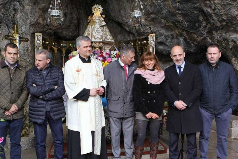 El presidente del Comité Organizador del Descenso Internacional del Sella (CODIS) y el alcalde de Parres, Emilio García Longo, llegaron a la Santa Cueva de Covadonga con los dos centros de flores que se ofrecieorn a la Santina y a Don Pelayo, por parte de la organización del Sella, que este año dedica la prueba a Covadonga, con motivo de los Centenarios que se conmemoran en torno al Santuario.
