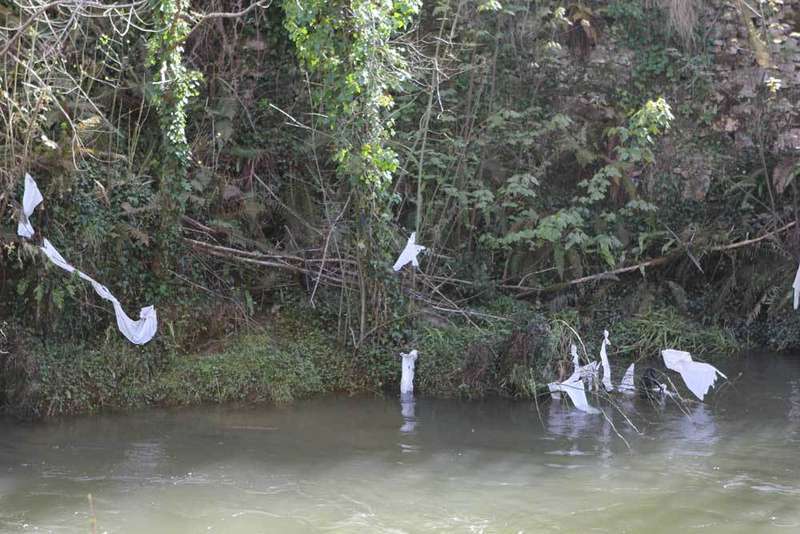 El último tramo del río Güeña antes de su desembocadura en el Sella ofrece estos días una imagen lamentable, con ambas márgenes plagadas de trozos de plástico enganchados en las ramas de los árboles y en la maleza.