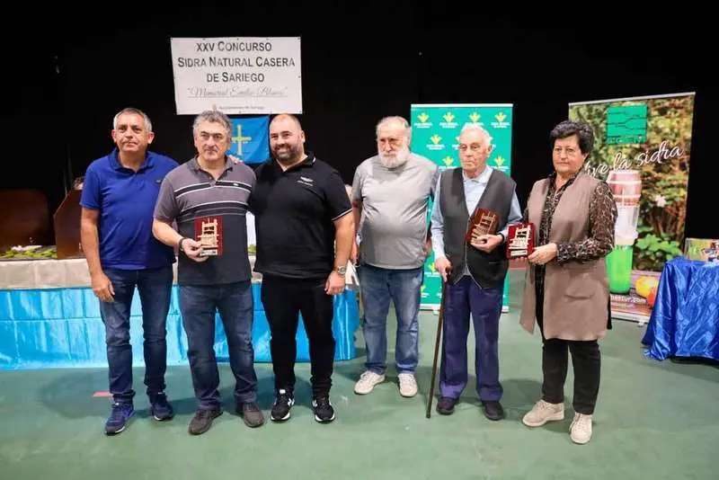Con Luis Estrada como maestro de ceremonias, no faltaron los gestos emotivos coincidiendo con el aniversario. El primero de ellos fue un homenaje a Francisco Suárez Sánchez, Juan Manuel Berros Bastián, Valentín Arboleya Parajón y Juan Carlos Alonso Vega que, a principios de 1996, fundaron la Asociación Amigos de la Sidra de Sariego con el objetivo de organizar diversas actividades. Ese mismo año, convocaron el I Concurso de Sidra Natural Casera de Sariego, que se disputó el 5 de julio en la sede del colectivo, El Mesón Sariego, y en el que participaron 17 personas. Los cuatro recibieron una placa conmemorativa y posaron junto a los primeros carteles originales del certamen.
