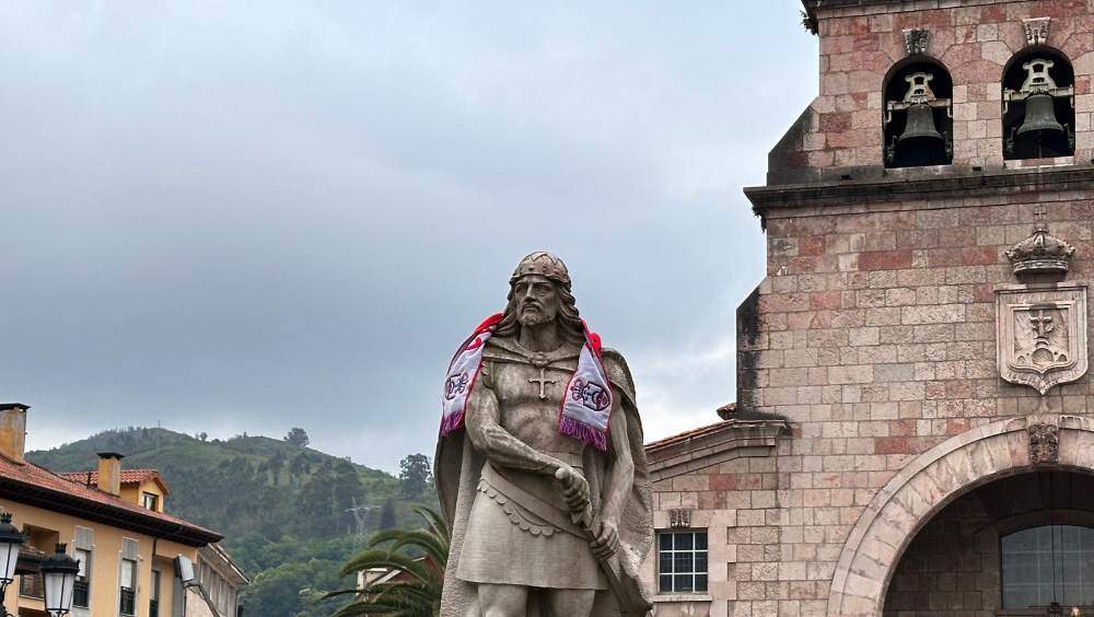La estatua de Don Pelayo volvió a lucir los colores del Cánicas AC para festejar un nuevo éxito del club cangués en el año de su centenario.