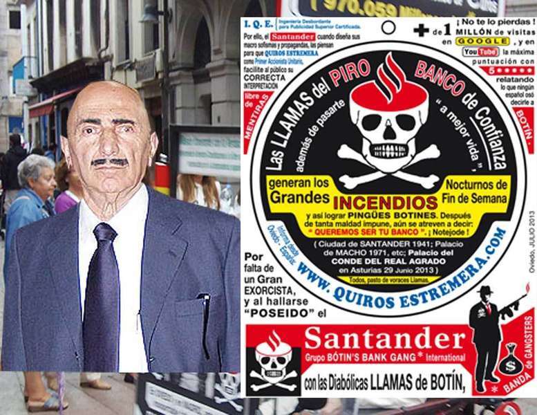 En paralelo a la protesta contra Gabino de Lorenzo, el ovetense también llevó a cabo una cruzada contra Emilio Botín y el Banco de Santander, "el Piro-Banco", como denominaba a la entidad que tiene en su logotipo una llama, en las pancartas que vestían una silla de ruedas eléctrica con la que también salió por las calles de Asturias y Cantabria y en la que asistió a una junta de accionistas del banco de Santander, en las que intervenía por ser poseedor de solo una acción, «soy el primer accionista unitario del banco» aseguraba.