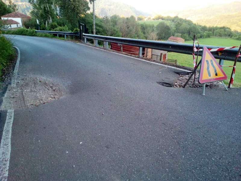 Hace meses que los vecinos y usuarios habituales de la carretera PR-5 (Entre el Puente Romano de Cangas de Onís-Ozanes, en Parres) denuncian un socavón que ha ido agrandándose y que ahora se ha convertido en un hundimiento que afecta al ancho de la vía y amenaza con cortarla al tráfico en aquel punto, a escasos 100 metros de la iglesia de San Juan de Parres, entre las localidades de San Juan y Bada.