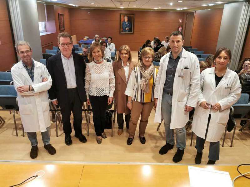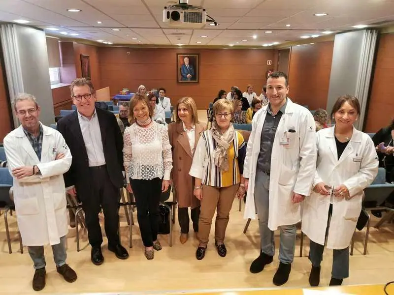 José Manuel Llera, Tomás Antuña Álvarez, Emma Argüelles Prendes, Mª Consolación Fonseca Rodríguez, Mª Teresa Muñoz González, Julio González Bastida y Mª Teresa Olmo Yáñez en el salón de actos del hospital de Arriondas