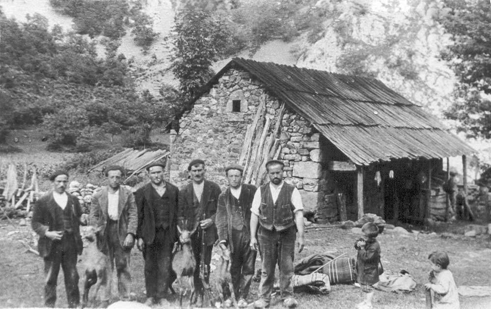 La casería fue aprovechada en comuña, entre el propietario y llevadores, hasta comienzos de los 60 en el pasado siglo XX. Su tierra, regada y llana, se despliega en una cota amable, en torno a los 600 metros de altitud, y en sus días tuvo molinos, cuadras, espléndidos maizales, como el que se adivina en la imagen tras los cazadores, los nogales -que persisten allí- y un buen repertorio de frutales, cuidados por la mano de campesinos radicalmente autosuficientes. El río y las truchas, el monte maderable, la leña por doquier, la caza…todo el abanico de recursos que compone la periferia de Llué hacían del sitio un verdadero paraíso en tiempos inclementes y en medio de un territorio dominado por la verticalidad.