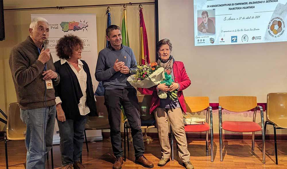 Paloma Aroca Pellico recibió la semana pasada, en el marco de la XIII Jornada de Voluntariado y Participación Social del Oriente de Asturias, que organiza La Red de Participación Social "Pueblos Solidarios" y el Centro de Voluntariado y Participación Social del área VI de la Asociación El Prial, un homenaje como ejemplo de «incansable voluntaria», a propuesta de la Asociación Emburria, el colectivo que ella impulsó junto a otras padres de hijos con discapacidad intelectual, hace 22 años, que hoy se ha convertido en el colectivo ejemplo de ayudas y servicios para las personas con diversidad funcional.