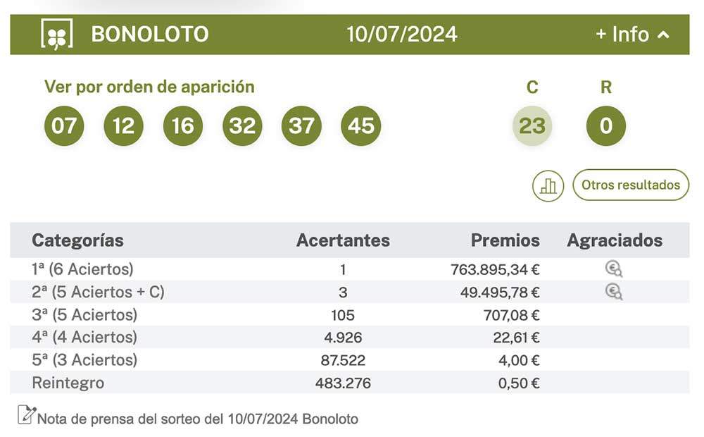 La combinación ganadora del sorteo fue 7, 12, 16, 32, 37, 45, complementario el 23 y reintegro el 0