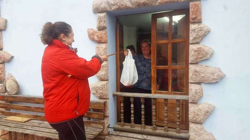 Los encargos se entregan siguiendo los protocolos y manteniendo las distancias de seguridad recomendadas por las autoridades como prueban estas imágenes, en las que las entregas de víveres y medicamentos se hacen por las ventanas con ayuda de un palo.