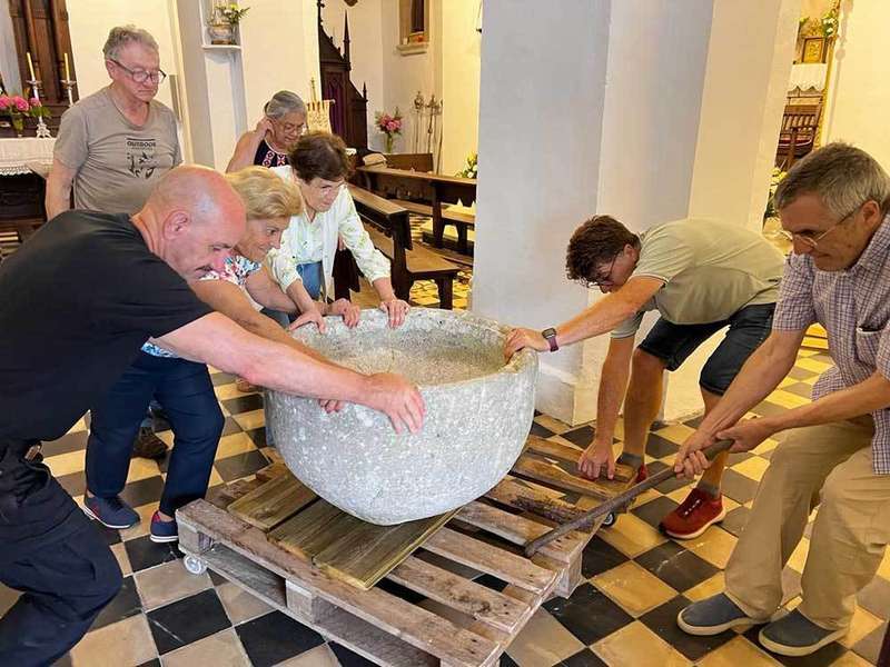 Vecinos de la localidad llanisca de San Roque del Acebal recuperaban hace unos días su antigua pila bautismal, extraída de la Iglesia local en los años 60. Se trata de una pieza de piedra cuya antigüedad se desconoce, «estimamos que, al menos, data del siglo XIX», explica Germán Abad Cuadriello, uno de los vecinos que participó en la iniciativa. «Está en muy buen estado, pero su colocación fue muy laboriosa ya que necesitamos palés con ruedas y un gato para elevarla», explica. Abad celebra la implicación de los parroquianos, «incluso el párroco agradeció en su homilía el trabajo de todos». Un particular sufragó todos los gastos.