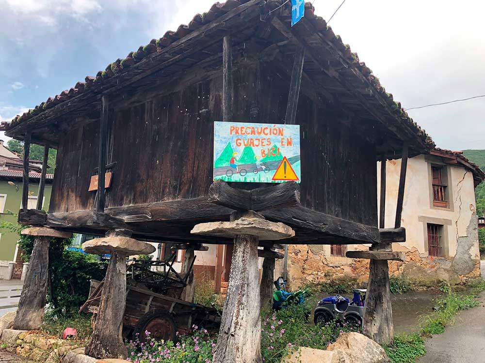 "Precaución. Guajes en bici", reza el mural que está colocado en la tenobia de un hórreo en Sirviella (Onís) para que los conductores que se adentran por las angostas calles de esta localidad vayan ojo avizor. Las vacaciones de verano atraen a cientos de visitantes a Sirviella, como al resto del Oriente de Asturias y también son fechas con más niños en el pueblo, jugando aquí y allá.