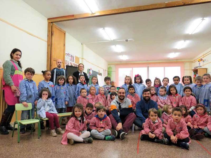 Jorge Duce y Manu Iglesias hablando de Xai-Xai a los alumnos de ciclo infantil del C.P.Río Sella