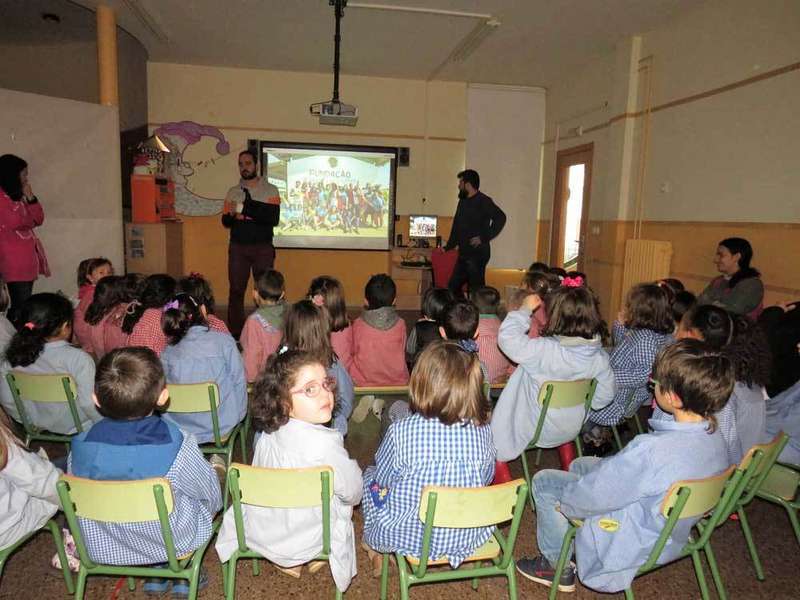 Jorge Duce y Manu Iglesias hablando de Xai-Xai a los alumnos de ciclo infantil del C.P.Río Sella