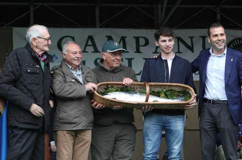 A las seis de la tarde, puntualmente, daba comienzo la Subasta del pez de 7 kilos y 190 gramos, que Juan Manuel González pescaba por la mañana en el pozu del Arcu. En las sillas reservadas para los pujadores estaban representantes de los restaurantes: Mesón Puente Romano, El Campanu, Casa Manuela, Hotel LosLagos, PuebloAstur, Fonte Villoria, Mendiondo, Gran Hotel Pelayo de Covadonga y Hotel María Manuela de Benia de Onís. En cuanto la puja llegó a los 9.700 euros sólo dos establecimientos aguantaron el tirón, El Campanu y Hotel María Manuela, que se batieron hasta llegar a los 11.900 euros, precio en el que se adjudicó el salmón a los restaurantes El Campanu.
