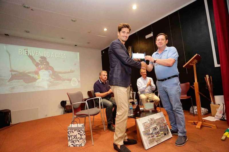 Hernanz fue recibido en la Casa Municipal de Cultura Benito Pérez Galdós, de Arriondas, en cuya entrada le esperaban los piragüistas locales del club Jaire Aventura Los Rápidos haciendo un pasillo con sus remos en alto.