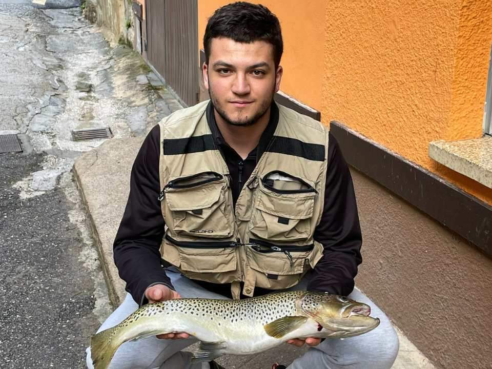 El joven cabraliego Pablo Bárcena Sánchez pesca una trucha de 3 kilos en Poncebos