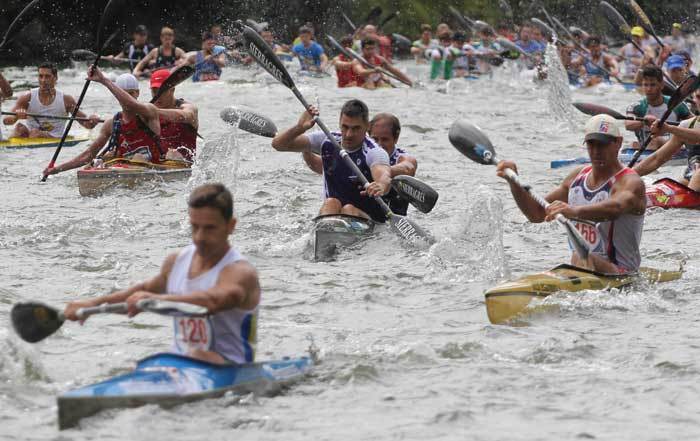 El maliayés Manolo Busto pregonó el 79º Descenso Internacional del Sella desde lo alto del puente de Arriondas y, acto seguido, se lanzó a correr para embarcar junto a su compañero de singladura, Francisco Luque Fernández, y bajar el Sella defendiendo los colores del Club Piragüismo Maliayo.