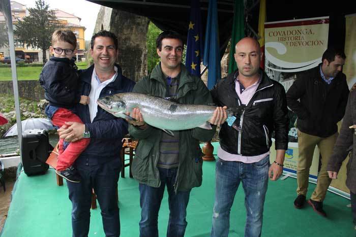 Los Restaurantes El Campanu adquirieron el campanu de Asturias, pescado esta mañana en el río Sella, por 5.500 euros en la subasta organizada en el Puente Romano, por el Ayuntamiento de Cangas de Onís.