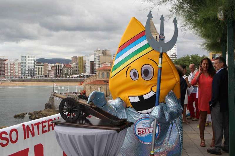 La mascota junto al cañón que simuló la salida del Sella en Gijón.