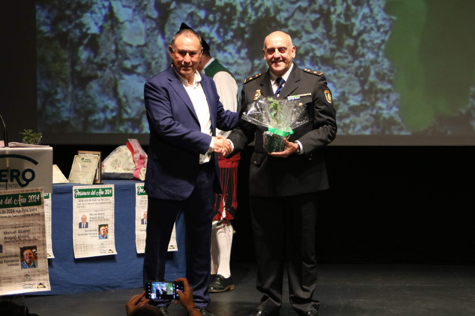 El jefe de la comisaría local de la Policía Nacional de Siero, el inspector jefe Alberto Aragón y el dueño del bar Pumarín, Gumersindo Fernández recibieron de manos del presidente de la Asociación de Amigos del Roble, Enrique Meoro, los premios que les distinguen como Personaje del año y Chigreru del año, respectivamente, en un acto que tuvo lugar en la Sala de cámara del Auditorio de Pola de Siero.