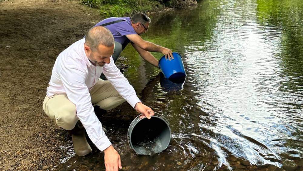 El alcalde de Siero, Ángel García "Cepi", y del concejal de abastecimiento de Agua y Saneamiento, Parque Móvil, Asociaciones de Vecinos y Centros Socioculturales en el Ámbito Rural, Pergentino Martínez, han participado en la suelta de alevines de trucha en el río Nora a su paso por Pola de Siero.