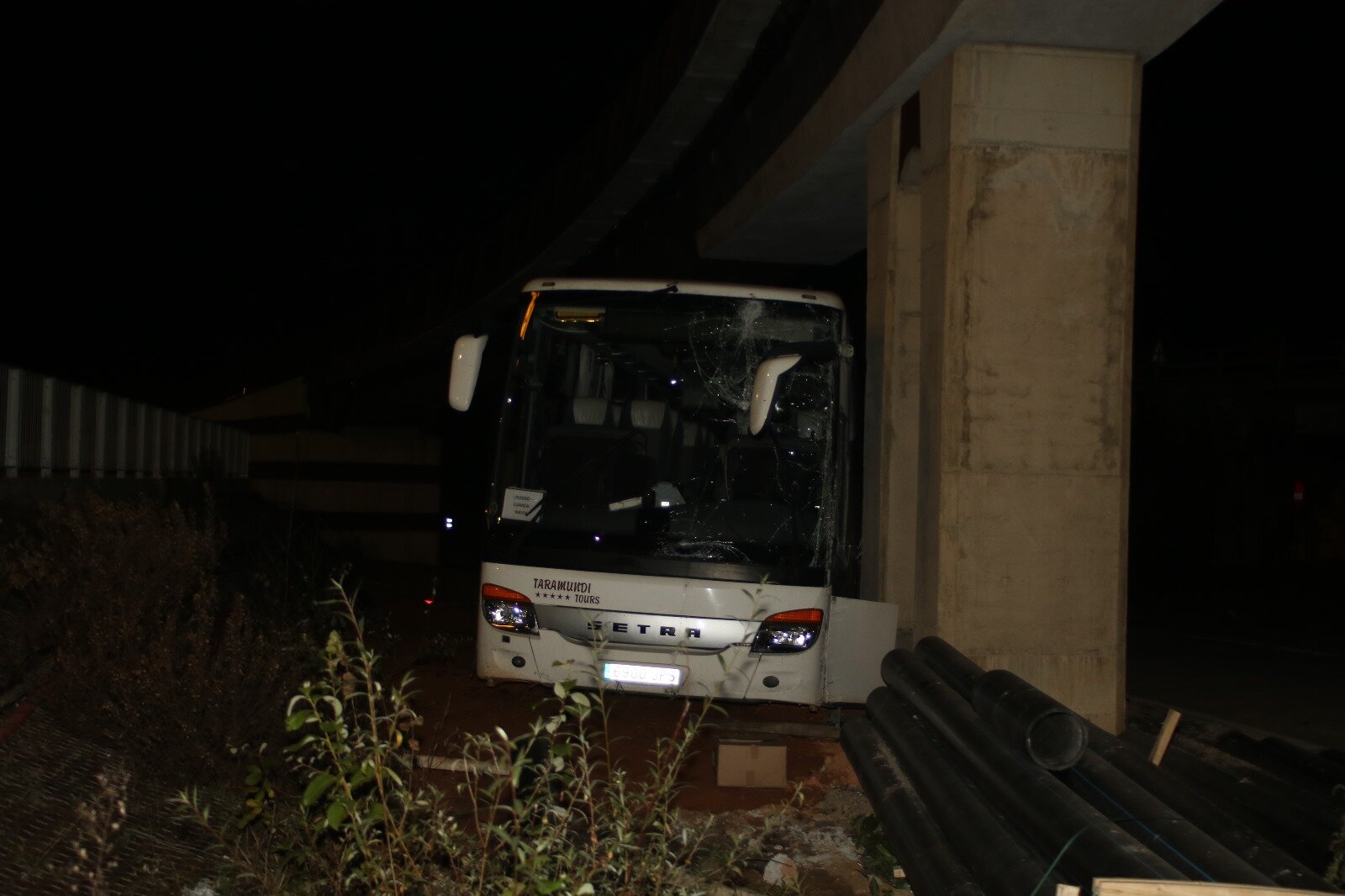 En la tarde noche de hoy se ha producido un accidente en la rotonda de la AS 17, bajo el nuevo puente que comunica la urbanización de La Fresneda y Lugones, recientemente inaugurado. Por motivos que se desconocen todavía, un autobús, de la empresa Taramundi Tours que venía del ramal de Posada de Llanera, se saltó el ceda el paso al llegar a la rotonda y continuó por el césped interior haciendo un recto, cruzando toda la circunvalación y finalizando su periplo contra uno de los pilares del puente.