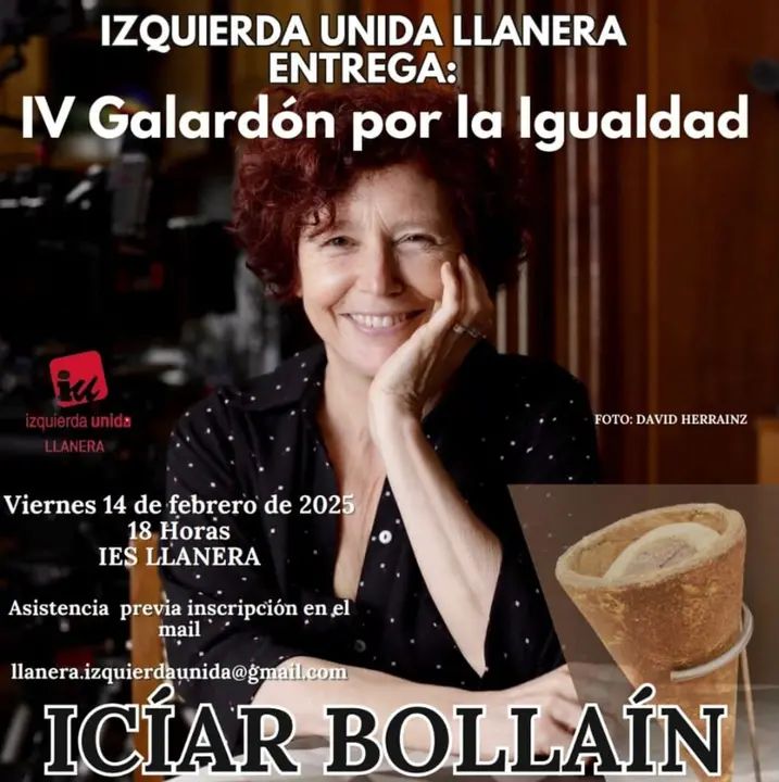 La directora de cine y guionista, Icíar Bollaín recibirá el IV Galardón por la Igualdad que otorga Izquierda Unida de Llanera por «Crear un cine social, con identidad propia, en su larga trayectoria como directora y guionista. Por su talento y capacidad creativa, su compromiso en defensa de la igualdad de género, los derechos humanos y la justicia social» según reza el acta del jurado. El acto de entrega tendrá lugar el viernes, 14 de febrero, a las seis de la tarde, en el IES de Llanera.