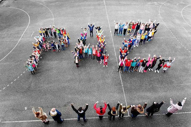 Estudiantes del último año de educación Infantil dibujan un corazón con sus manos.