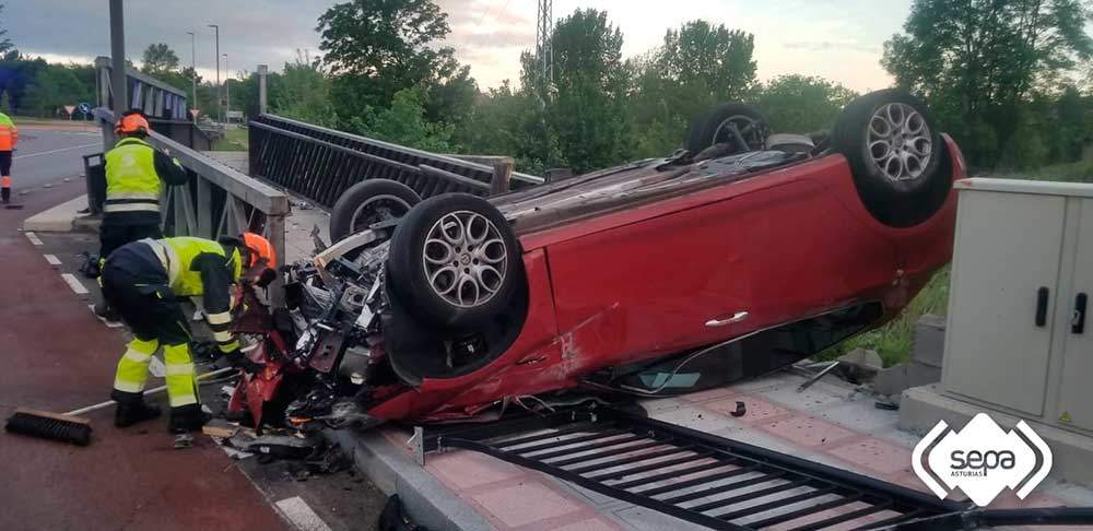 Espectacular vuelco de un turismo en Pola de Siero