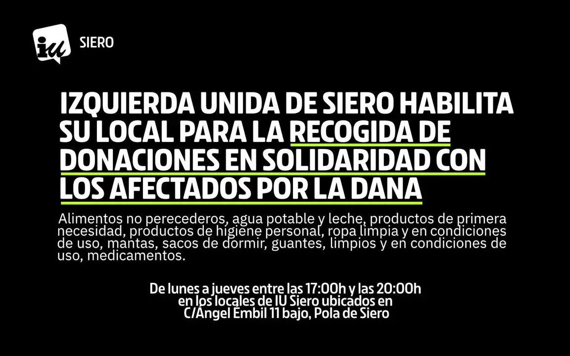 Ante la grave catástrofe causada por la DANA, desde Izquierda Unida de Siero nos sumamos a los esfuerzos solidarios y habilitamos nuestro local en C/Ángel Émbil 11 bajo, Pola de Siero para la recogida de productos de primera necesidad destinados a las personas afectadas.