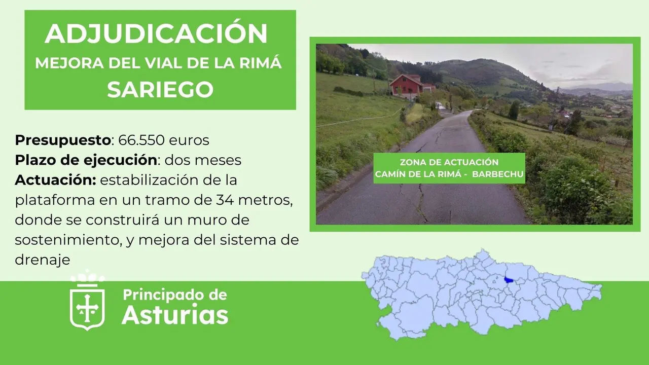 La Consejería de Fomento, Cooperación Local y Prevención de Incendios ha adjudicado a la empresa Contratas Souto SL las obras para la mejora del vial de La Rimá, en el concejo de Sariego, por 66.550 euros. Los trabajos tienen un plazo previsto de ejecución de dos meses.