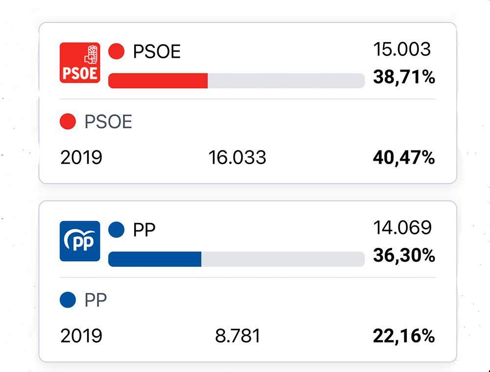 En el Oriente de Asturias se jugaba fuerte estas elecciones porque las encuestas apuntaban a la posibilidad de que el PSOE perdiera uno de sus tres concejales, los otros dos los tenía el PP. Finalmente a pesar del subidón del PP que pasó de 8.781 votos a 14.069, el reparto se mantiene: 3 diputados para el PSOE y 2 para el PP. El PSOE pasó de 16.033 en 2019 votos a 15.003 el domingo. La tercera fuerza en el Oriente fue Vox, con 3.573 votos. Le siguen por este orden IU (1.854), Foro (1.487) y Podemos (999).