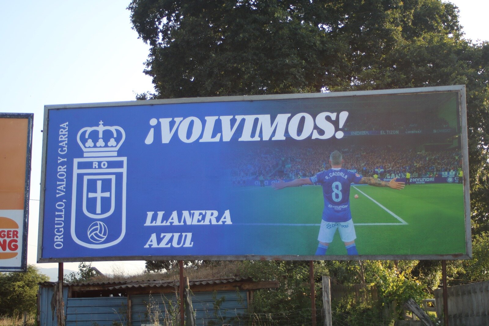 No hay escapatoria posible. Lo primero que verán los aficionados rojiblancos que el sábado acudan a la la quinta edición de la Concentración de Peñas del Real Sporting que se celebrará en Posada de Llanera, será una enorme valla publicitaria, en la rotonda de entrada al pueblo, en la que los aficionados oviedistas dan la «bienvenida» a sus rivales históricos con un palmario ¡VOLVIMOS!, adornada por una foto del héroe carbayón –nacido en Lugo de Llanera– Santi Cazorla y un recordatorio de los que hacen daño: LLANERA AZUL recordando, una vez más, a los sportinguistas –como si hiciera falta– que el cuadro del Carlos Tartiere es nuevo equipo de la máxima categoría del futbol nacional mientras que los de la ribera del Piles han de remar, otro año más, por el fango de la segunda.