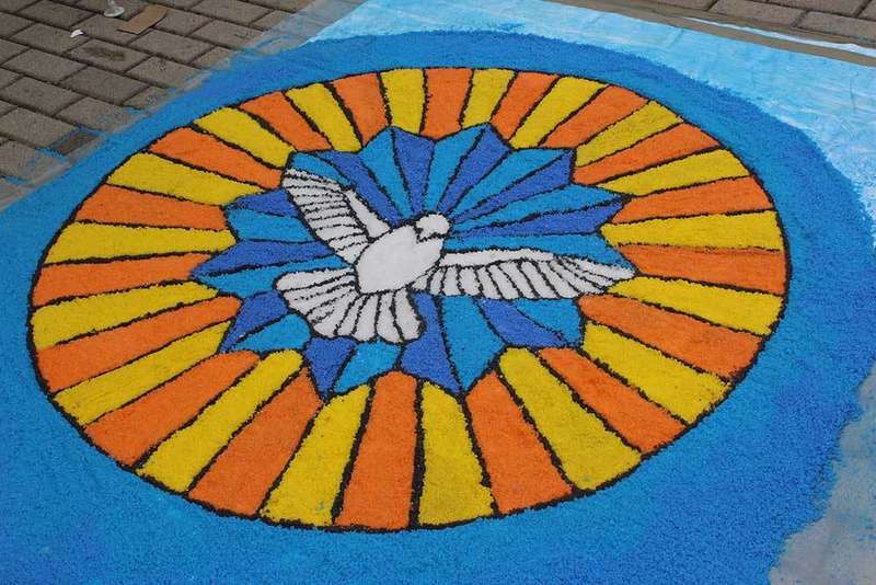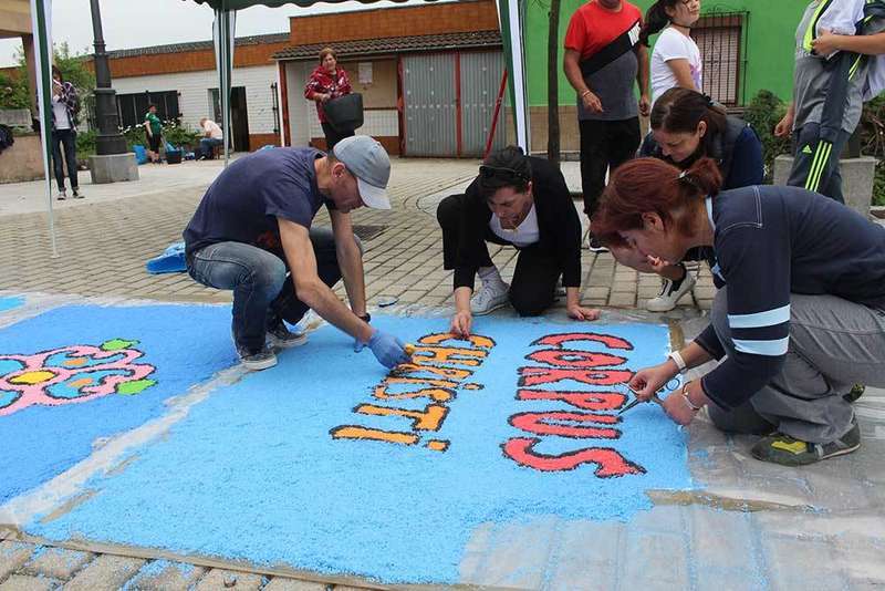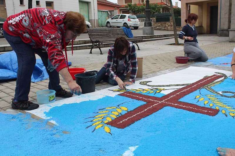 La idea parte del grupo de catequistas de la parroquia que, ayudados por padres de los niños de primera comunión, miembros del coro y vecinos, decoran la alfombra, una iniciativa que «está abierta a todo el mundo», puntualizó Crespo.