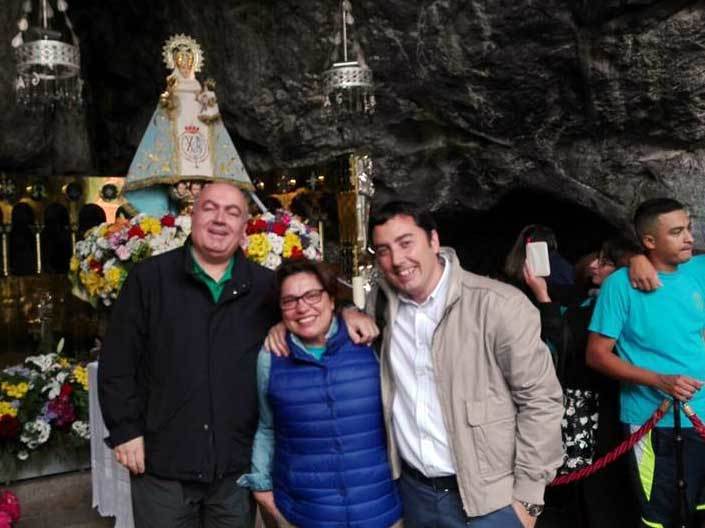 El párroco José Julio Velasco, Pilar Fernández y Gerardo Sanz con la Santina.