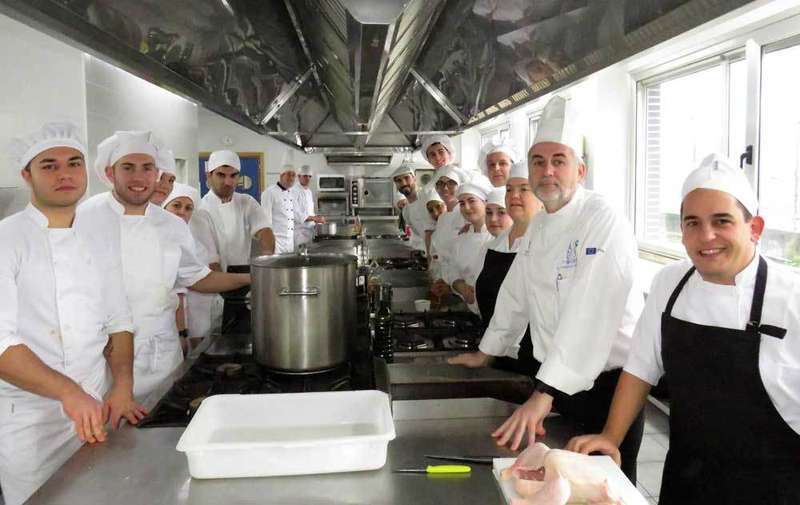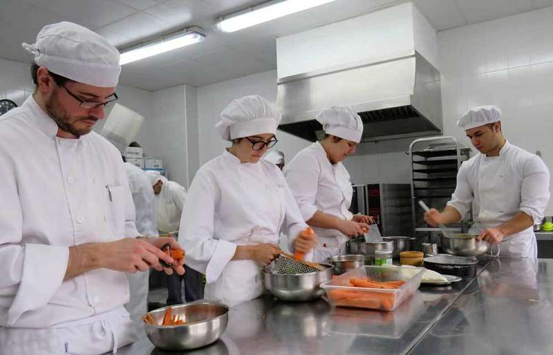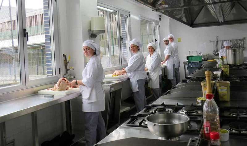 Junto a Jaime del Llano, en estas cocinas trabajan enseñando otros profesores, que se reúnen a esta hora para tomar café y tortilla de patata (buenísima, por cierto) en un pequeño despacho. Son Juan García y Celia Crespo, que también enseñan cocina; Roberto Álvarez, profesor de pastelería; Óscar Díaz, que ostenta el título de ser el primer becario que trabaja aquí; Paula Iglesias, que se encarga de que todo esté preparado y perfecto en sala; y Dolores Díaz, que alterna labores de profesora de sala y de jefa de estudios. Me cuentan que los alumnos de esta escuela tienen edades que van desde los 16 a los cincuenta y pico años. Que el 100% de los que se forman aquí salen con un trabajo en hostelería y en la zona. Que el año pasado se dejaron más de 25 ofertas de empleo sin cubrir. Que la gastronomía es un nicho laboral en auge, quizás motivado por programas de televisión. Pero que al menos esa publicidad le da mérito a la profesión, que antes era peor mirada. Que están intentando que en el centro se incorpore el módulo de Grado Superior, sobre dirección en servicios de restauración. El último escalón para ofrecer desde aquí una formación completa en cocina. Con prácticas reales y oportunidades de trabajo.