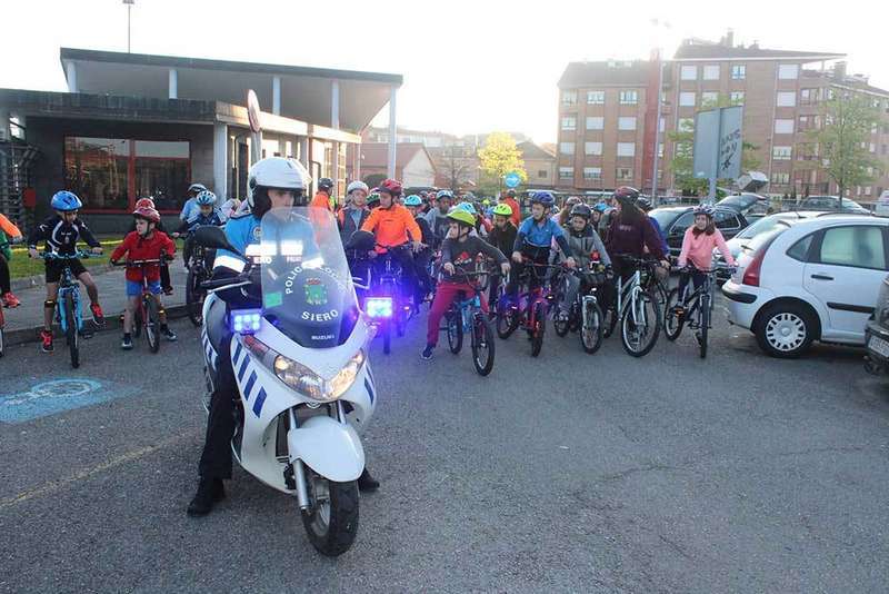 Casi 80 alumnos del Colegio Santa Bárbara de Lugones (Siero) cambiaron su habitual medio de transporte para acudir a las aulas por la bicicleta. Hoy jueves, 19 de abril, Día Mundial de la Bicicleta, los estudiantes, acompañados por algunos padres, profesores, el alcalde de Siero, Ángel García, y el portavoz de Ciudadanos, Sergio García, fueron a clase dando pedaladas.
