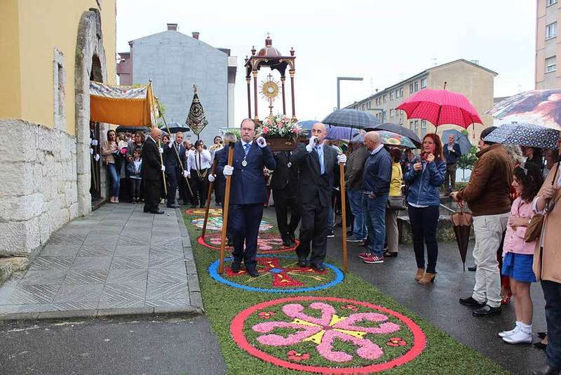 Pese a las inclemencias del tiempo, con protagonismo del orbayu, los niños de primera comunión salieron en procesión. Por dos veces, el párroco Joaquín Serrano preguntó a los chavales si querían salir en procesión y todos dijeron que sí. Los 40 niños que este año recibieron la comunión abrieron la procesión seguidos por la Custodía, en baldaquino y bajo palio, de los dos curas. A la salida no pisaron la alfombra, pero a su regreso al templo, anunciada por una descarga de voladores, sí.