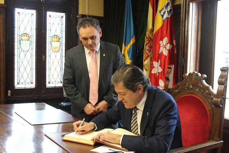 El presidente del ejecutivo asturiano firmando en el libro de honor del Ayuntamiento.