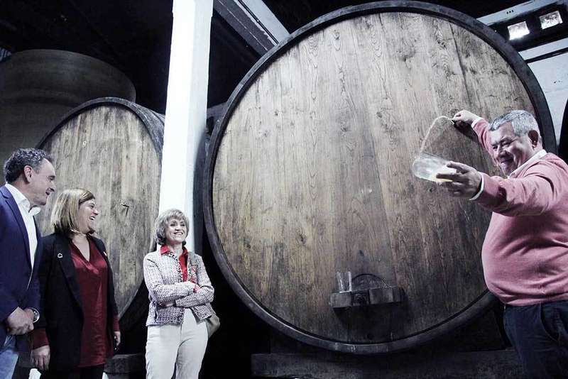 El afamado lagarero abrió las puertas de su empresa y espichó unos culinos de sidra a la ministra y sus acompañantes