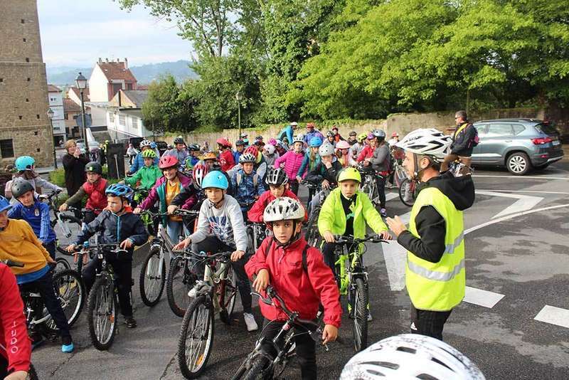 La cuesta de la calle de la Iglesia no fue ningún impedimento para los escolares, que seguían las indicaciones del profesorado:«circular por el carril de la derecha, señalizar cuando vayamos a hacer las incorporaciones a otra calle».