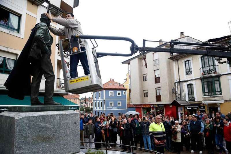Para llegar hasta la estatua de bronce, obra del artista valenciano Mario Belliure y que se levanta en la Playina, los chavales contaron con la ayuda de un vehículo municipal con grúa, tal como se puede ver en la imagen.