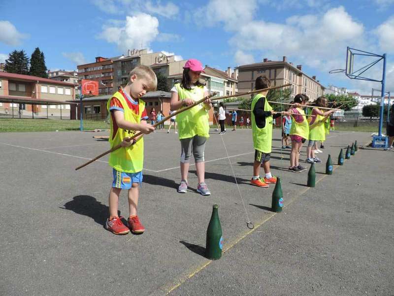 Los chavales que participan en las dos colonias veraniegas de Noreña –la de la AMPA del Colegio Público Condado de Noreña y la Municipal– compartieron una jornada de juegos tradicionales de la mano del polifacético Pola.