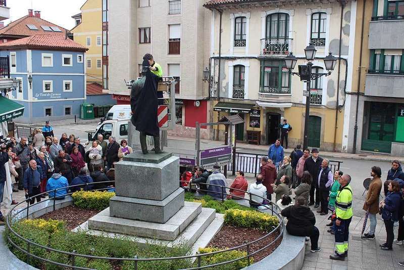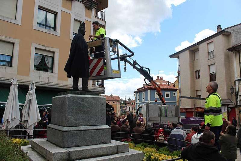 Un operario del Ayuntamiento fue el encargado de colocar la montera y la capa a la estatura de Pedro Alonso.